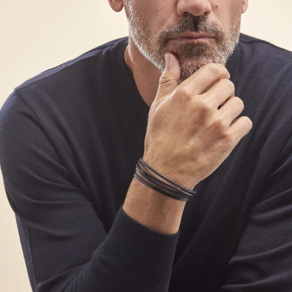 Bracelet Acier Inoxydable Blanc Multi Bracelets Tressé Cuir De Vache Bleu Et Marron Synthetique 21cm