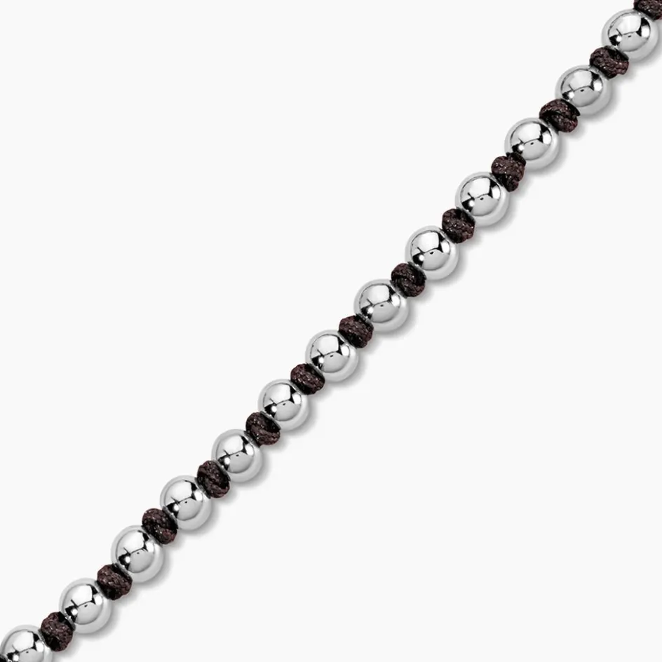 Bracelet Acier Inoxydable Blanc Boules Et Cordon Nylon Marron Foncé 18-27Cm