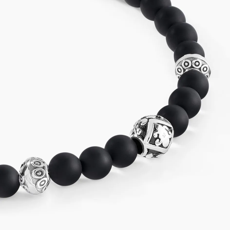 Bracelet Acier Inoxydable Gris Boules Pierres Agates Noires 22cm