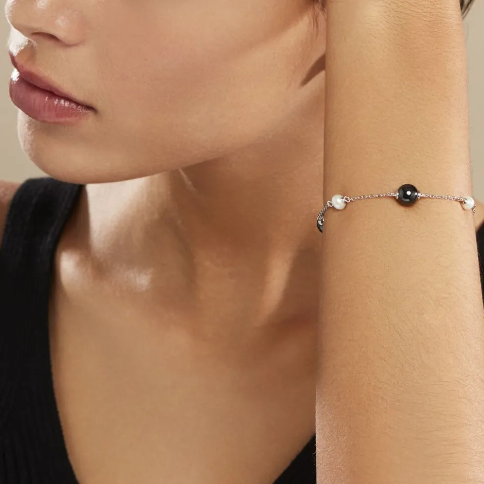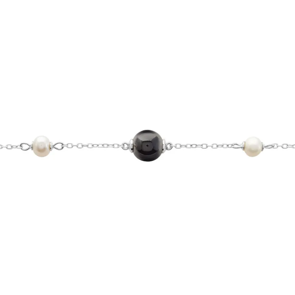 Bracelet Argent Blanc 925/1000 Perles De Culture Et Boules Ceramique Noire Maille Forcat 19cm