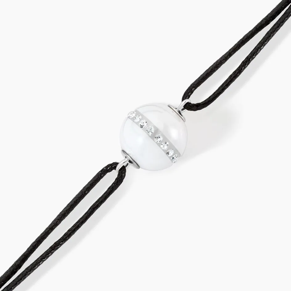 Bracelet Argent Blanc 925/1000 Boule Ceramique Blanche Lisse Pierres Blanches Sur Cordon Noir