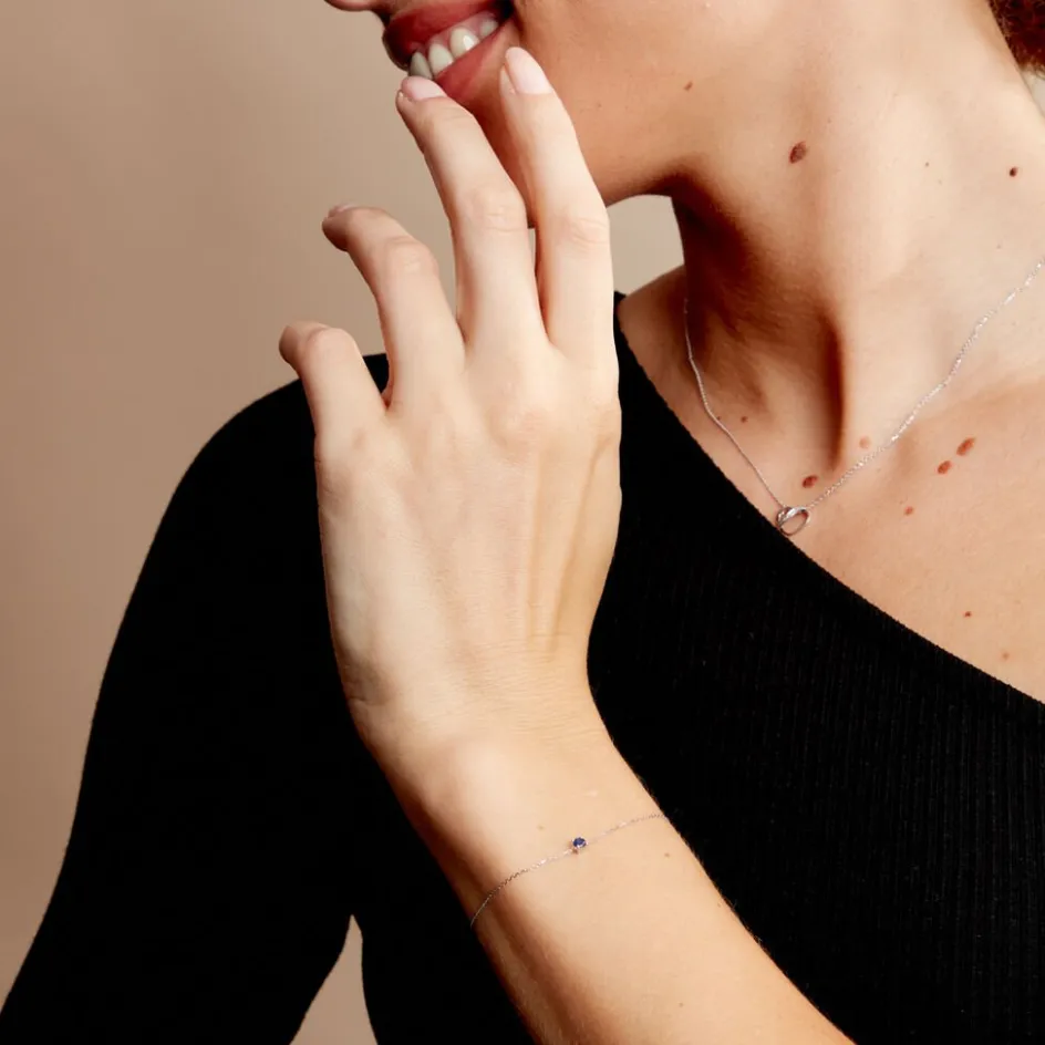 Bracelet Solitaire Or Blanc 375/1000 Saphir Serti Griffes 0.12ct Maille Forçat 18cm