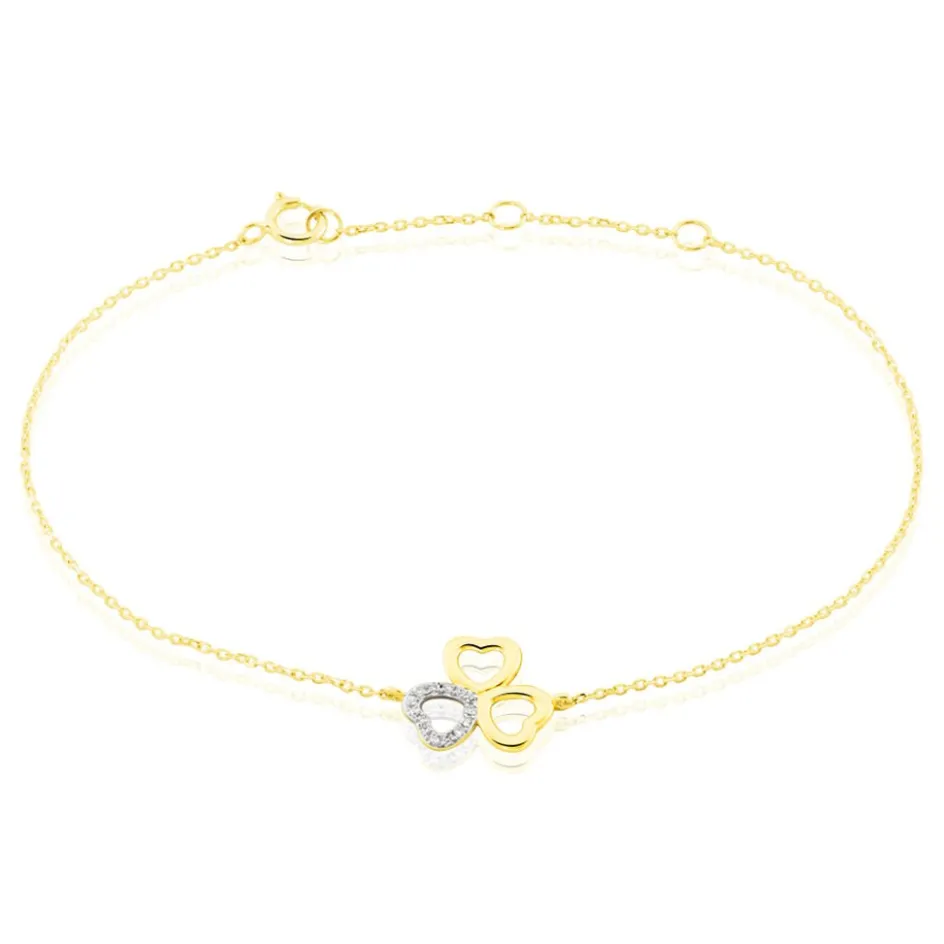 Bracelet Or Jaune 375/1000 Forme Triple C艙urs Maille Forçat Pavage Diamants 18.5cm