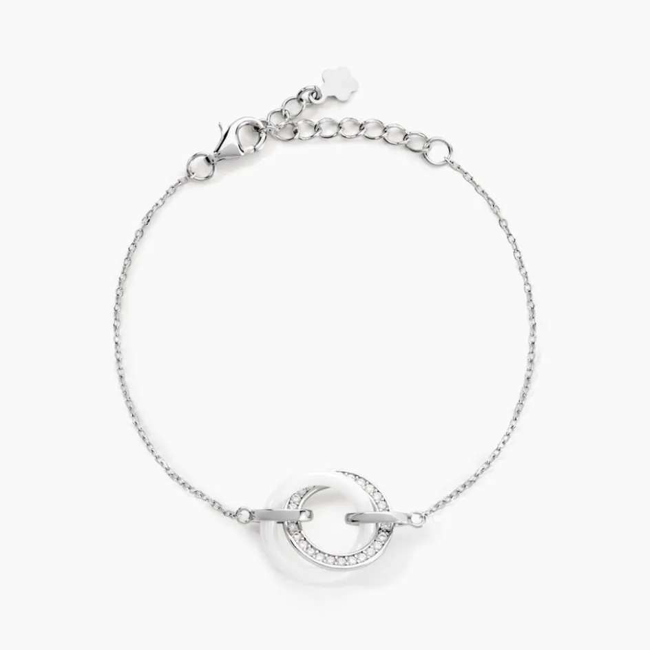 Bracelet Argent Blanc 925/1000 Céramique Blanche Ovale Pavage Oxydes De Zirconium Maille Forcat 15.5+3cm