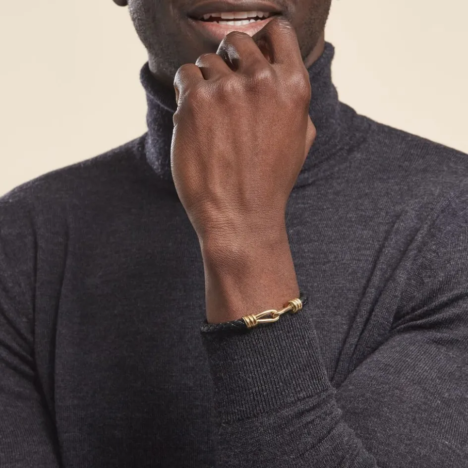 Bracelet Plaque Or Jaune Maillons Entrelaces Cordon Tresse Cuir Noir 21cm