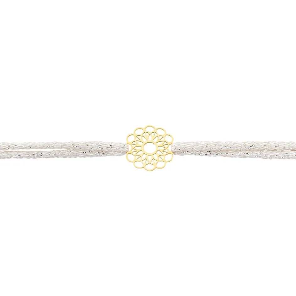 Bracelet Or Jaune 375/1000 Rosace Cordon Synthetique Ajustable Blanc Paillete Argente 18cm