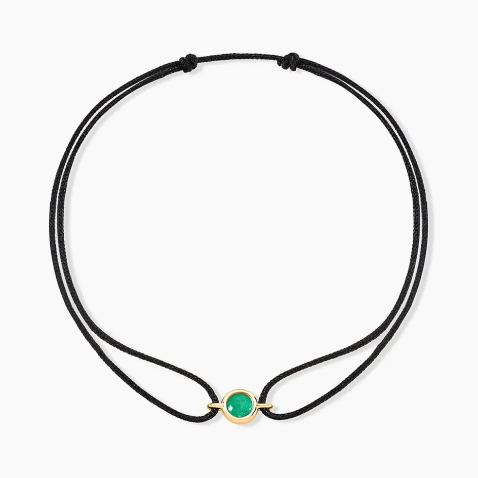 Bracelet Or Jaune 375/1000 Emeraude Ronde 0,11Cts Serti Clos Cordon Nylon Noir Ajustable