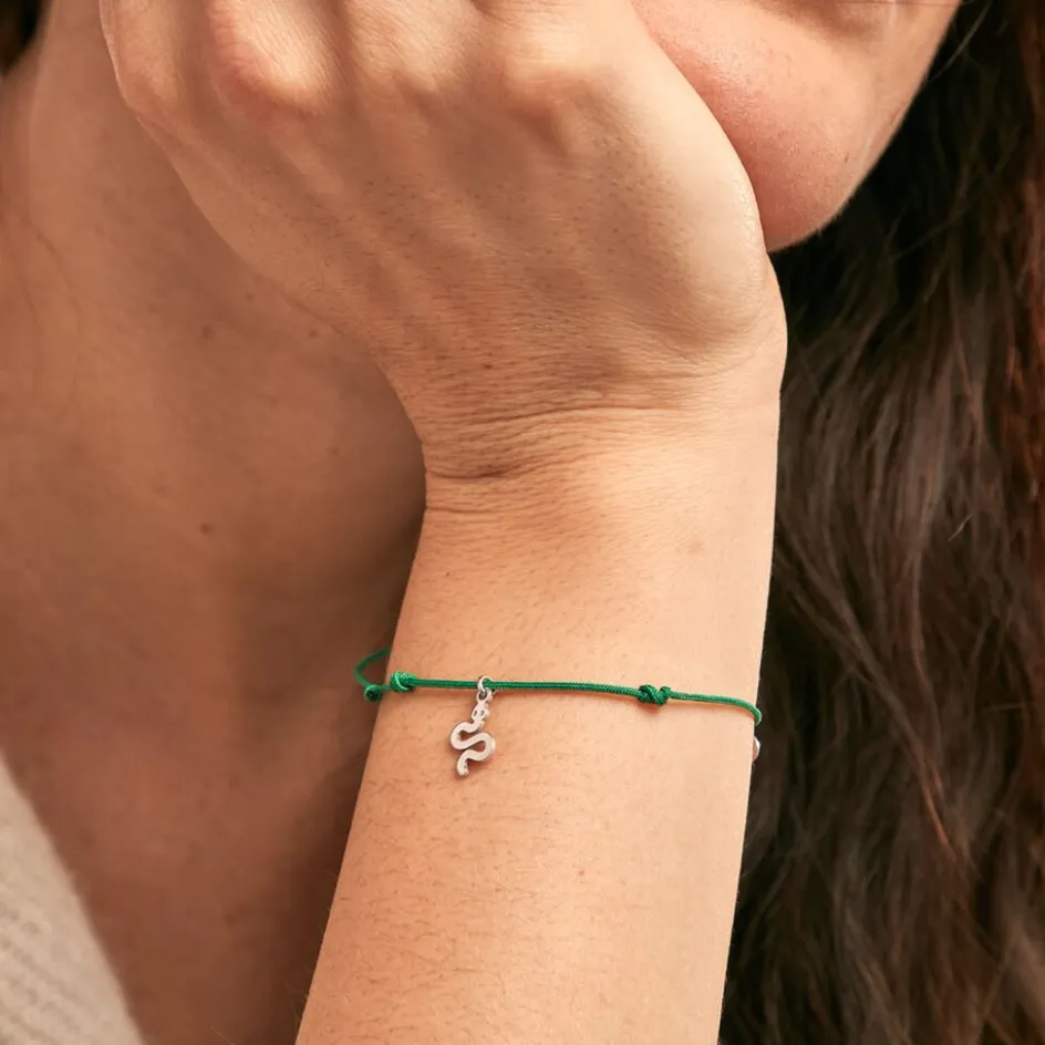 Bracelet Argent Blanc 925/1000 Pampille Serpent Cordon Vert Ajustable