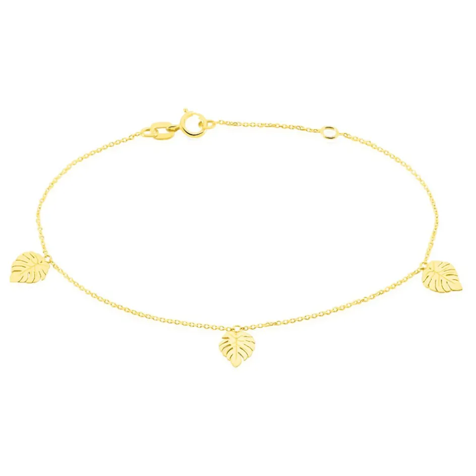 Chaine De Cheville Or Jaune 375/1000 Pampilles Motifs Feuilles Tropicales Maille Jaseron 24cm