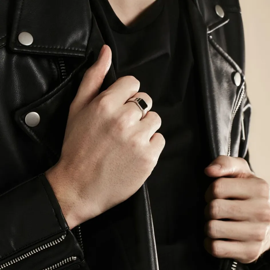 Chevalière Argent Blanc 925/1000 Carre Email Noir