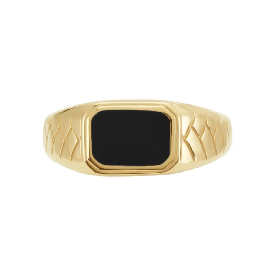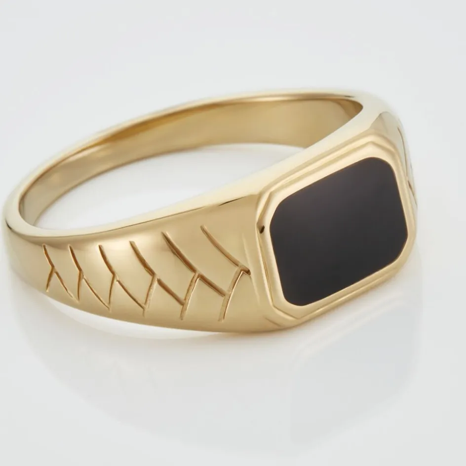 Chevalière Plaqué Or Jaune Carré Email Noir Corps De Bague Chevrons