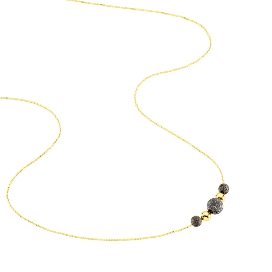 Collier Or Jaune 375/1000 2 Petites Boules Lisses + 3 Boules Sablees Noires Maille Forcat 41cm