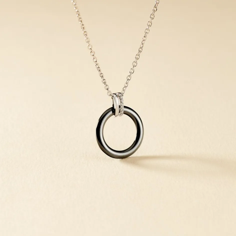 Collier Argent Blanc 925/1000 Cercle Ceramique Noire Et Lien Demi Pave Oxydes De Zirconium 45cm