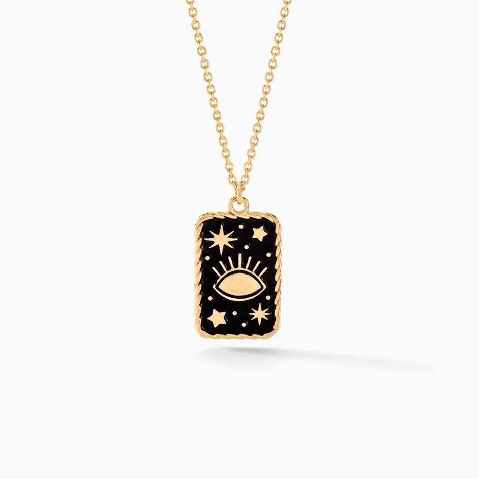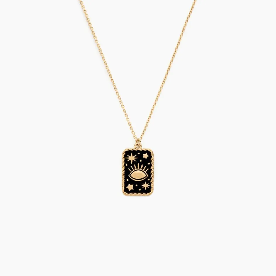 Collier Or Jaune 375/1000 Oeil Plaque Rectangle Email Noir Maille Jaseron 40+2cm
