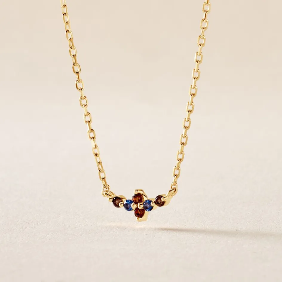 Collier Plaqué Or Fleur Pierres De Synthèses Bleues Et Marrons Maille Forçat 45cm