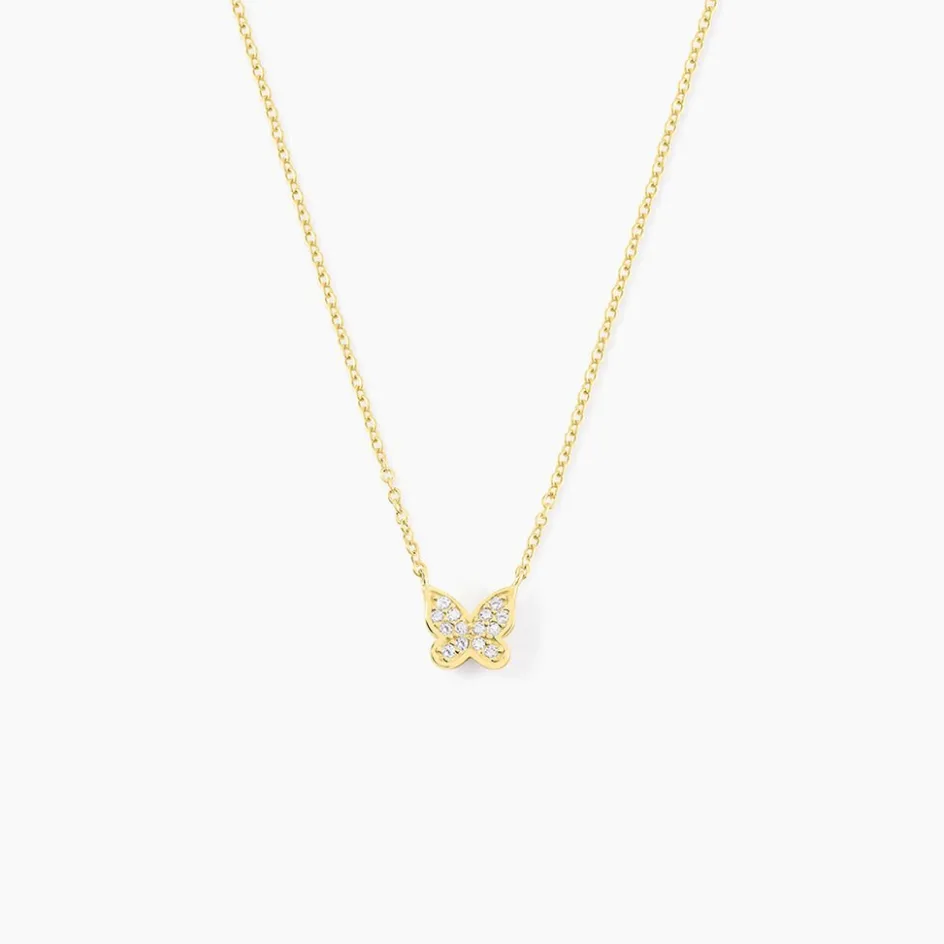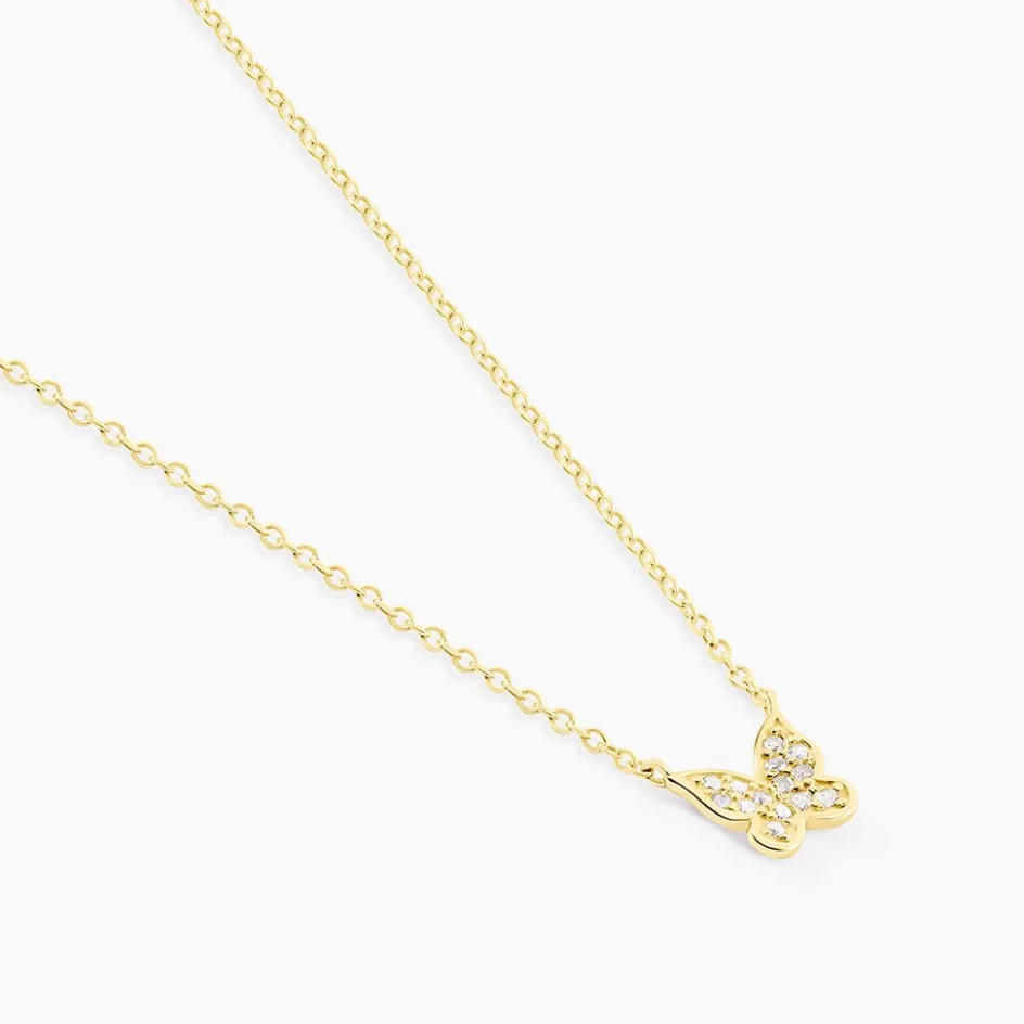 Collier Court Argent Rose 925/1000 Papillon Oxyde De Zirconium Maille Forcat Serti Griffes 38cm