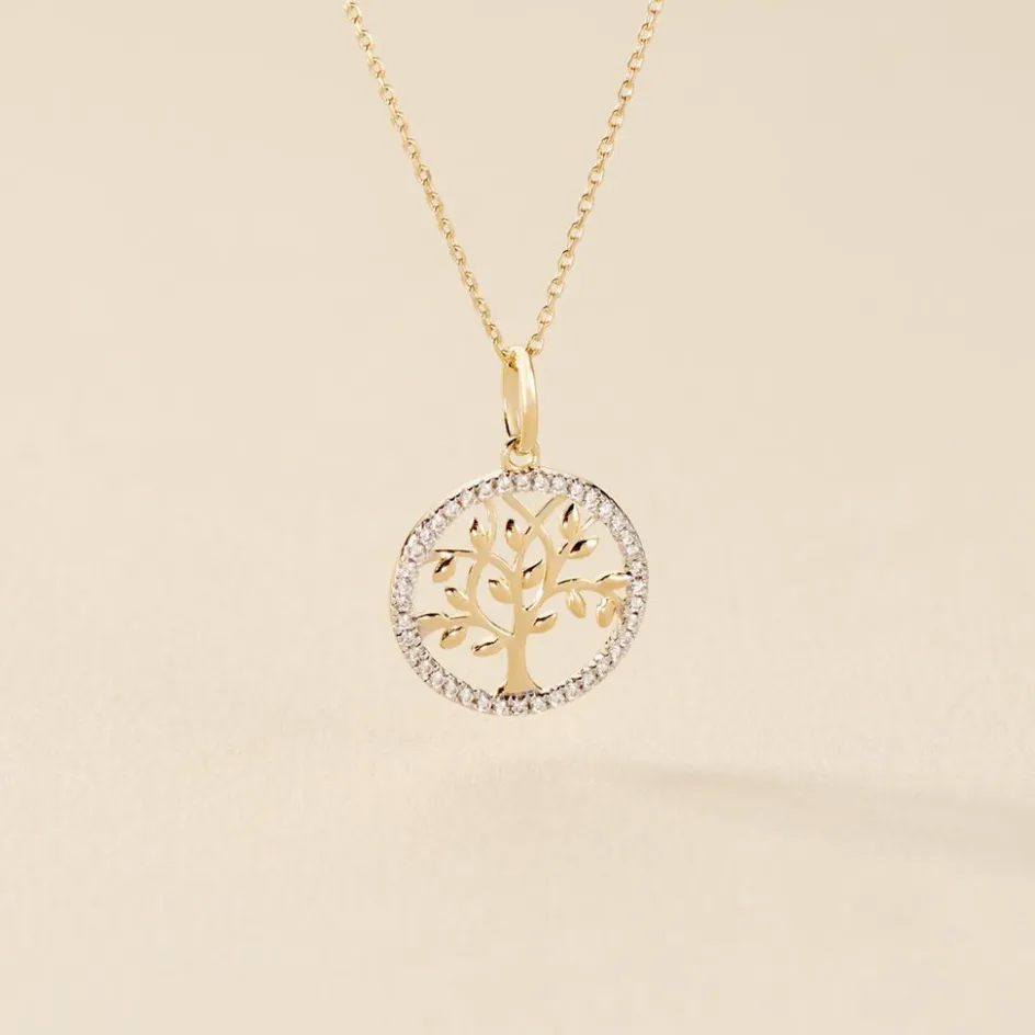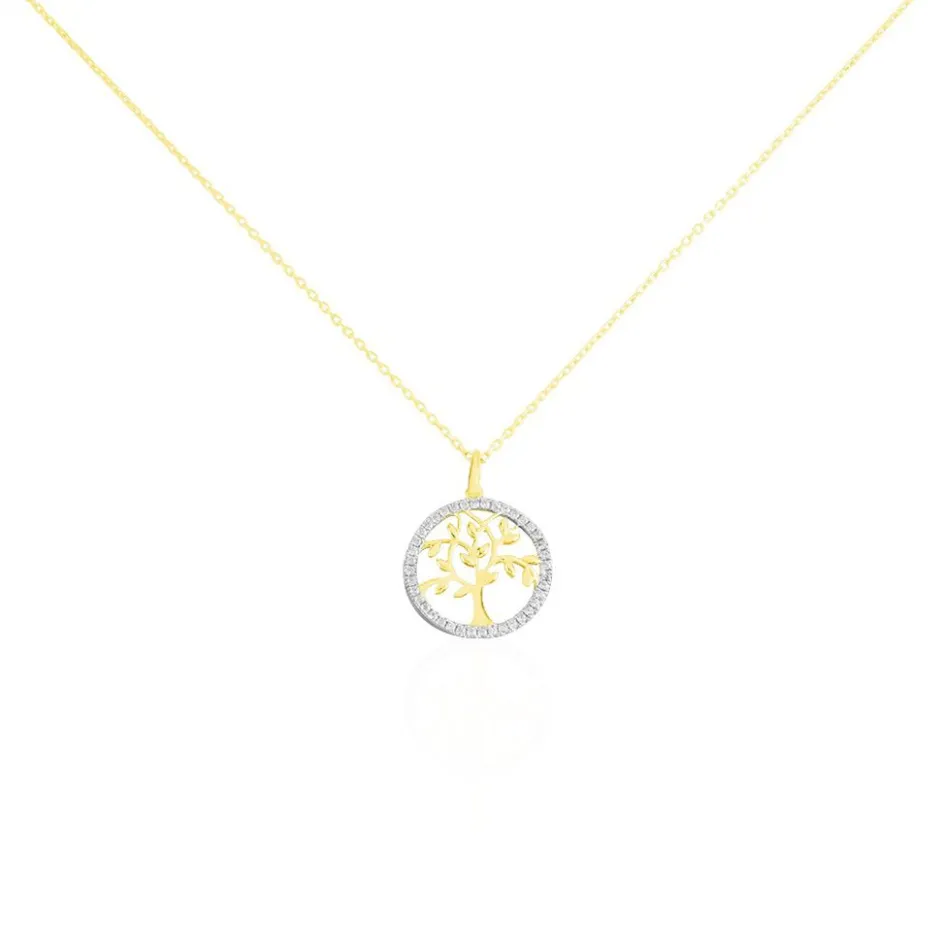 Collier Or Jaune 375/1000 Arbre De Vie Micro Pavage Oxydes De Zirconium Maille Forçat 38+4cm