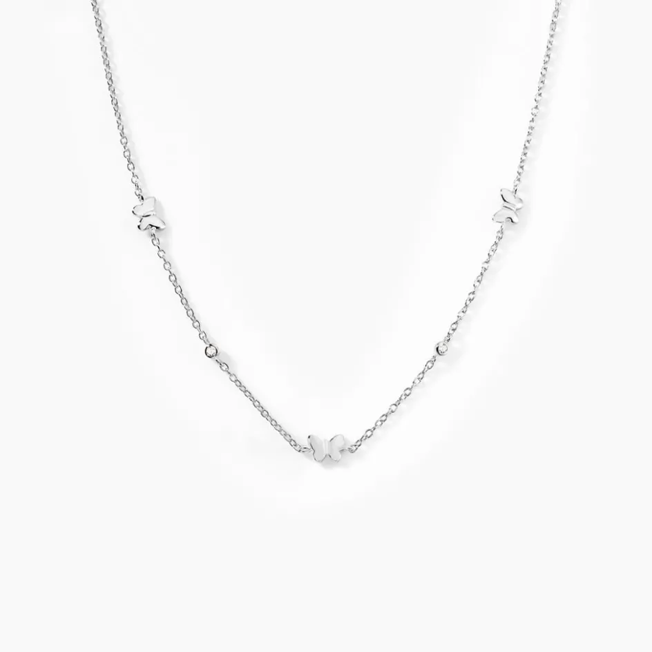 Collier Argent Blanc 925/1000 Papillons Et Oxydes De Zirconium Maille Jaseron 40+2cm