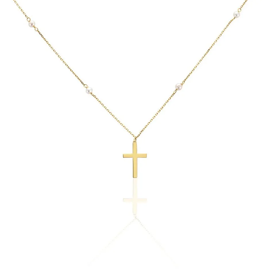 Collier Or Jaune 375/1000 Croix Lisse 4 Perles De Culture Blanches Percees Maille Forcat 40+2cm