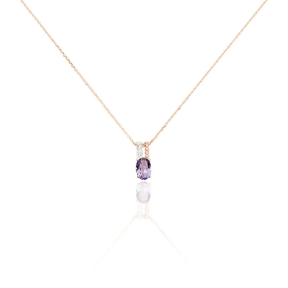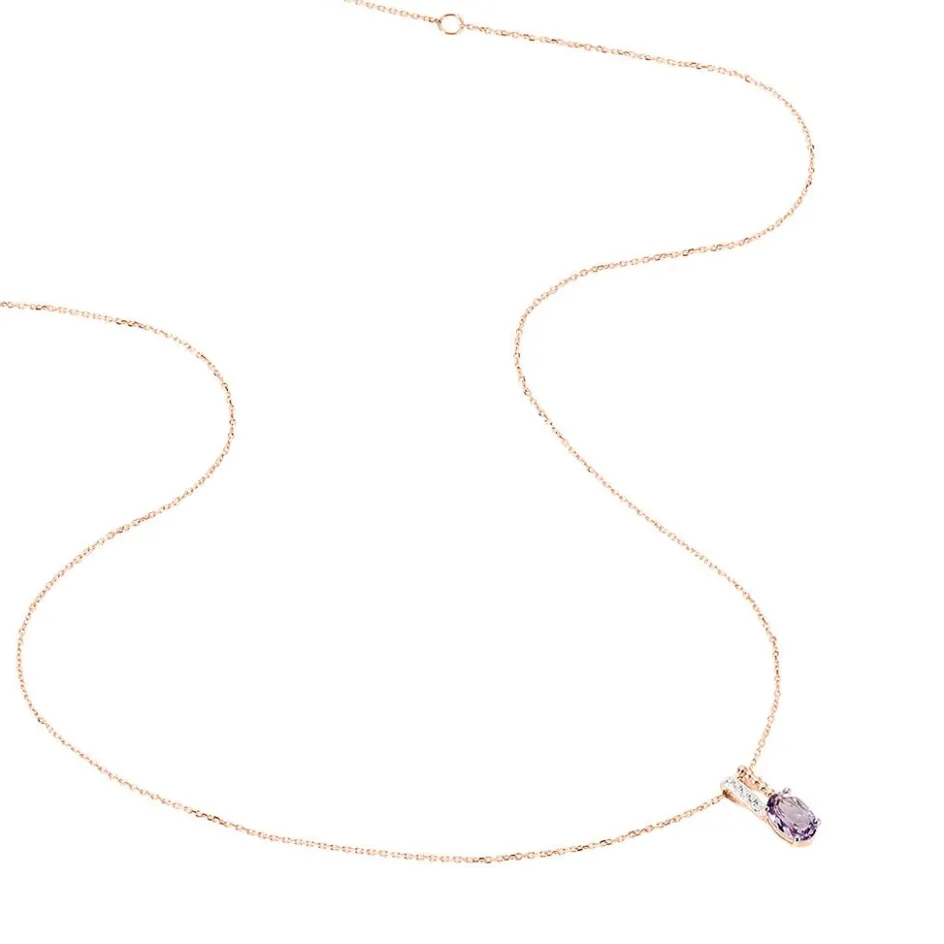 Collier Or Rose 375/1000 Améthyste Forme Ovale Ajoure Et Perle + Semi Pave Oxydes De Zirconium 42cm