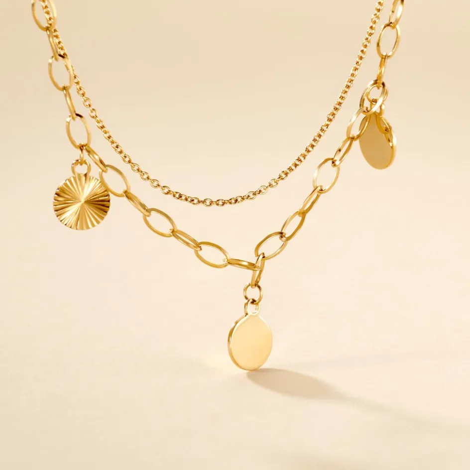 Collier Acier Inoxydable Jaune 3 Pastilles Double Rang Mailles Cheval Et Forcat Largeur 4mm 40+5cm