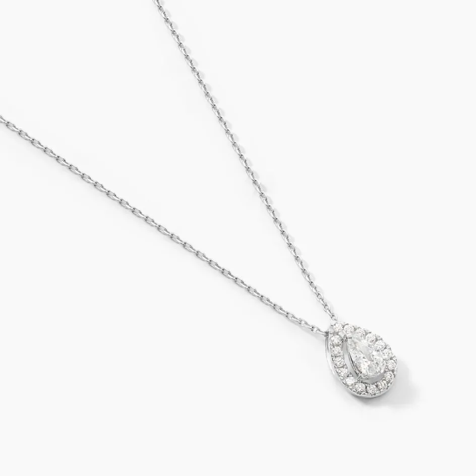 Collier Or Blanc 375/1000 Solitaire Oxyde De Zirconium Central Forme Poire Entourage Oxydes De Zirconium 42cm