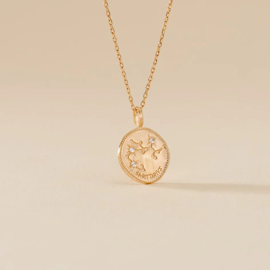 Collier Plaqué Or Jaune Pastille Mate Signe Astrologique Sagittaire Oxydes De Zirconium Chaine Forcat 50cm