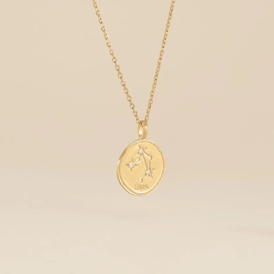Collier Plaqué Or Jaune Pastille Mate Signe Astrologique Balance Oxydes De Zirconium Chaine Forcat 50cm
