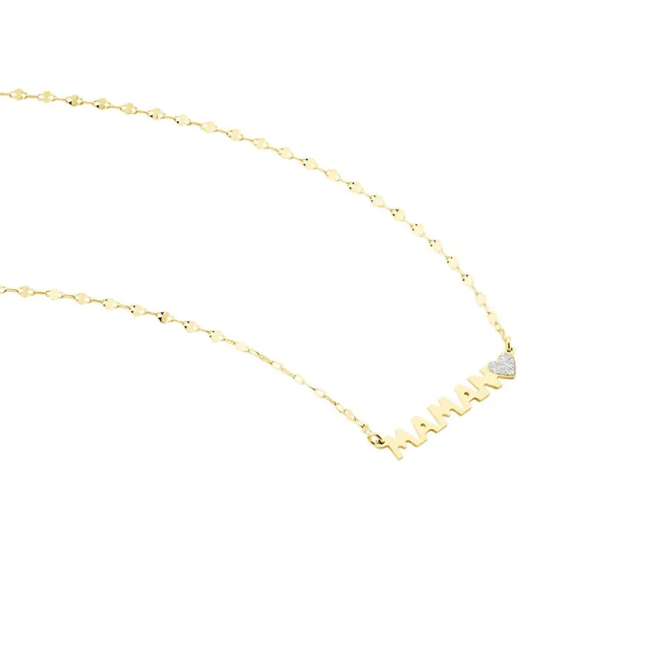 Collier Or Jaune 375/1000 Message Maman Lettres Decoupees + Coeur Plein Glitter Argente Maille Lumina 40+2cm
