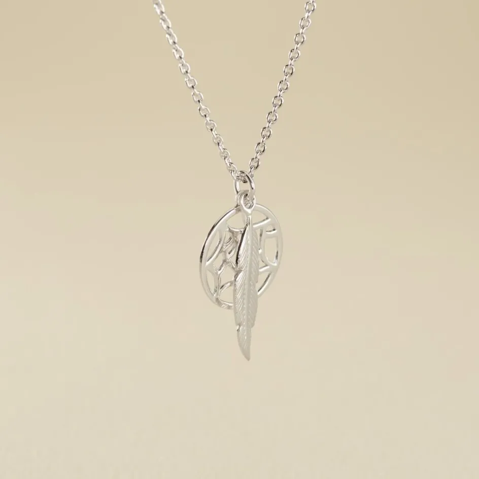 Collier Argent 925/1000 Rosace Pampille Plume Maille Forçat 45cm