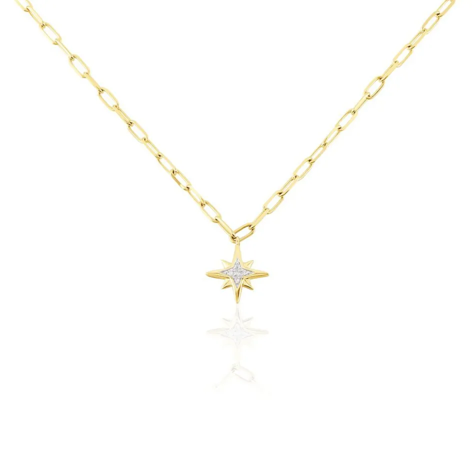Collier Or Jaune 375/1000 Motif Etoile Diamants 0.028cts Micro Serti Maille Cheval 40+2cm