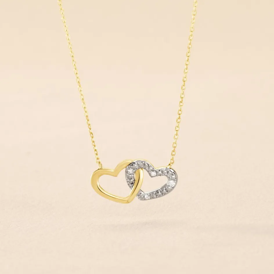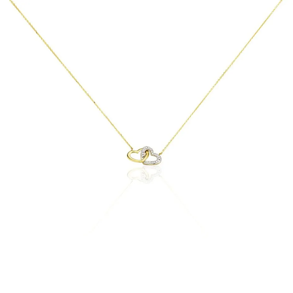 Collier Or Jaune 375/1000 Forme Double C艙ur Pavage Diamants Maille Forçat 42cm