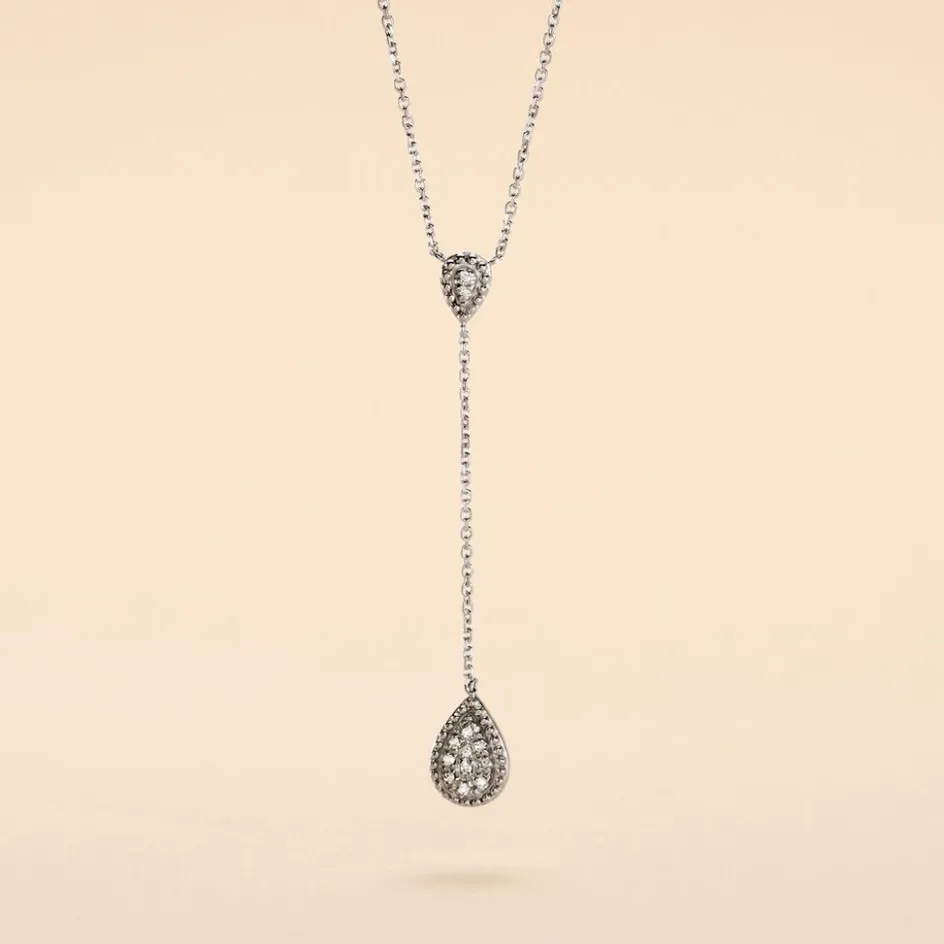 Collier Or Blanc 375/1000 Cravate Forme Goutte Pavage Diamants 42cm