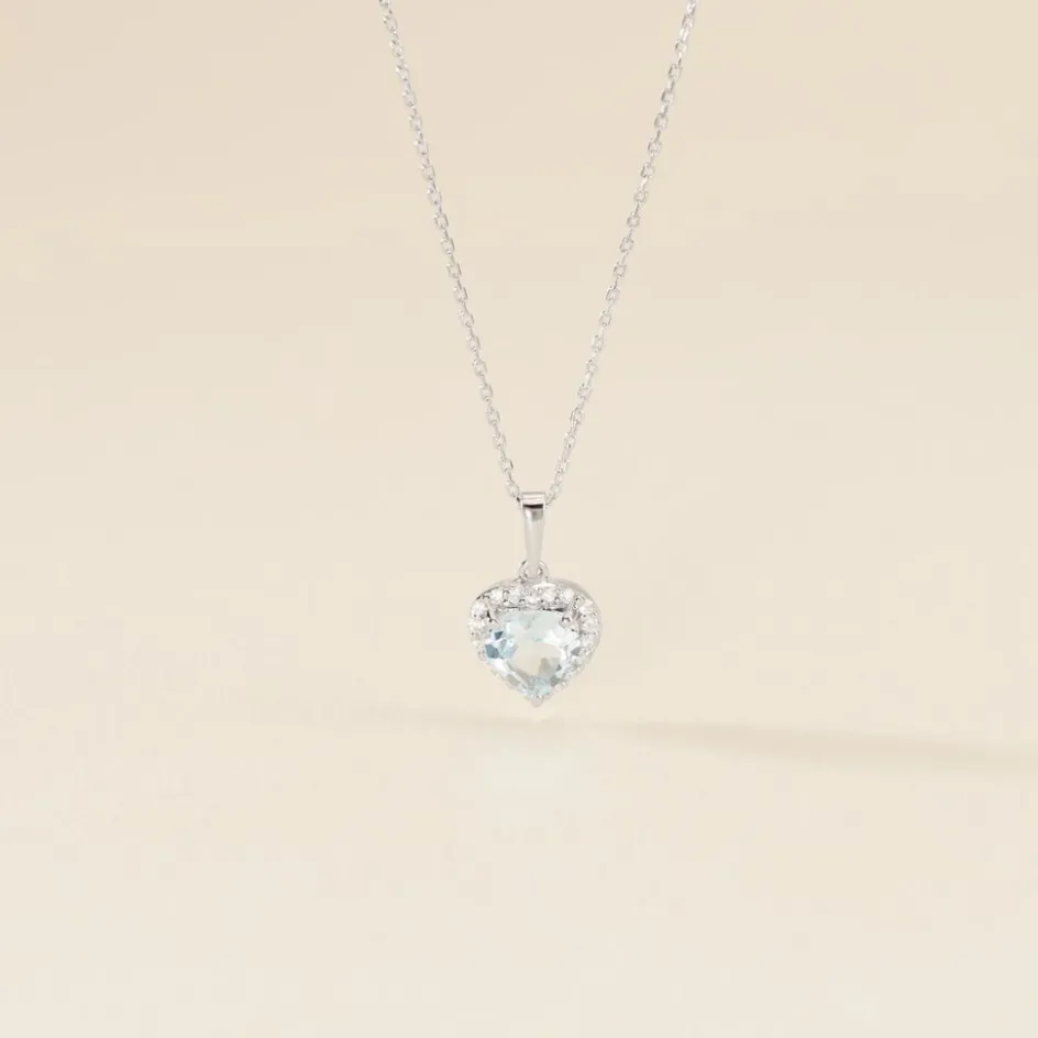 Collier Or Blanc 375/1000 C艙ur Topaze Sky Blue 0.8ct Serti 3 Griffes Maille Omega 42cm