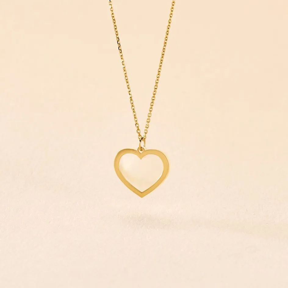 Collier Or Jaune 375/1000 C艙ur Ajoure Et Nacre Maille Jaseron 40+2cm