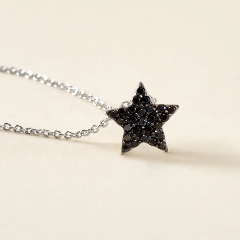 Collier Argent Blanc 925/1000 étoile Pavage Spinelle Noir Maille Jaseron 40+4cm
