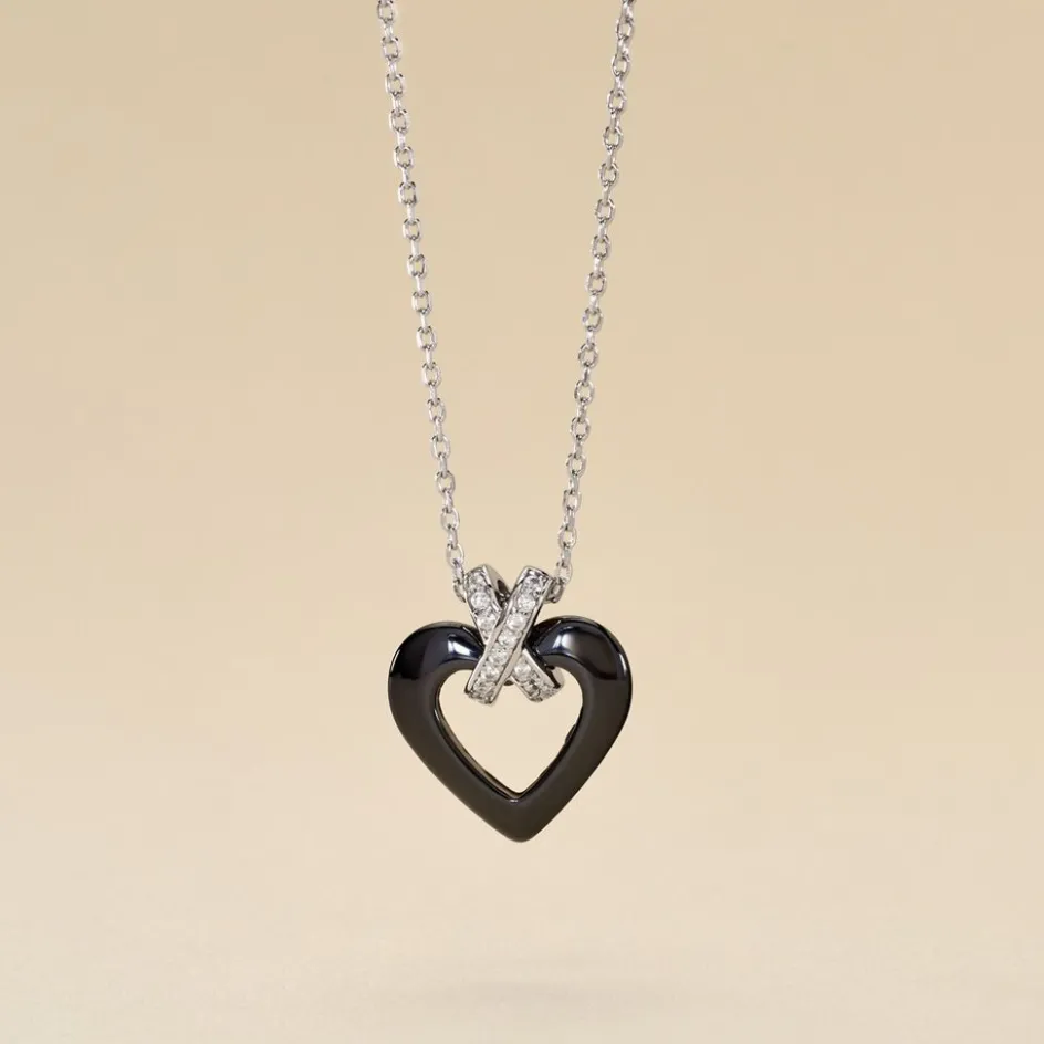 Collier Argent Blanc 925/1000 Ceramique Noire Forme Coeur Croix Pavee Oxydes De Zirconium 42cm