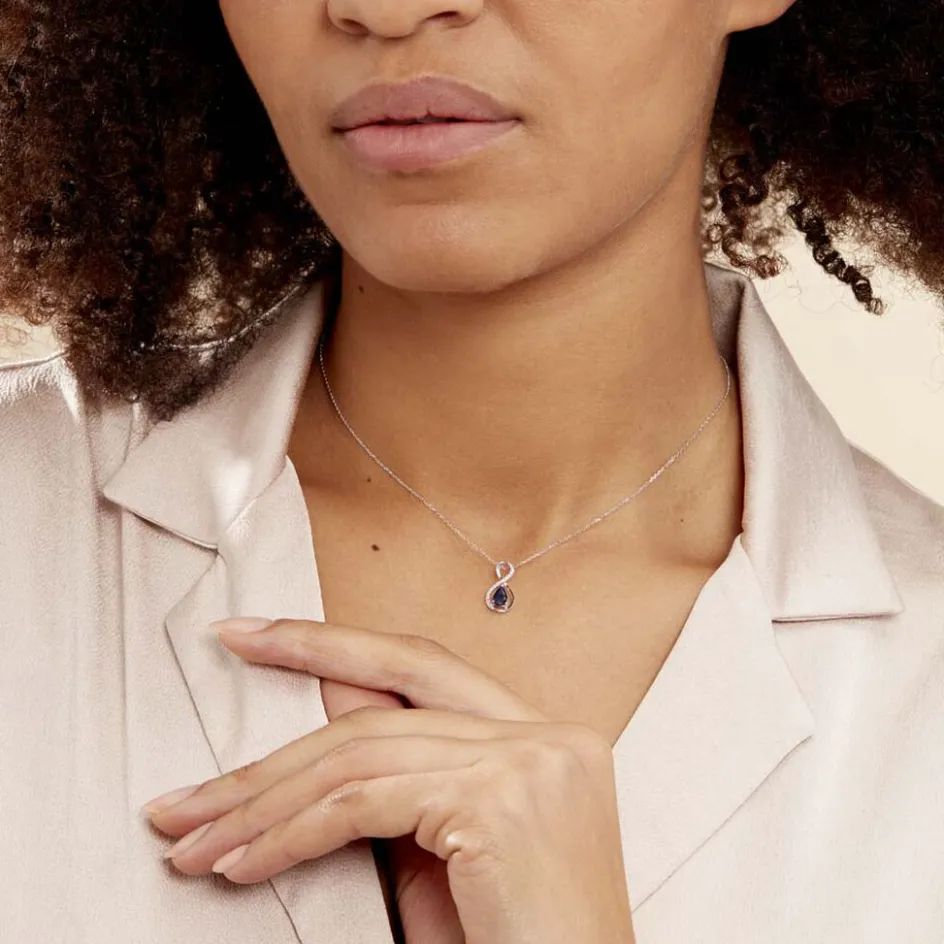 Collier Or Blanc 375/1000 Saphir Central Et Pavage Diamants 42cm