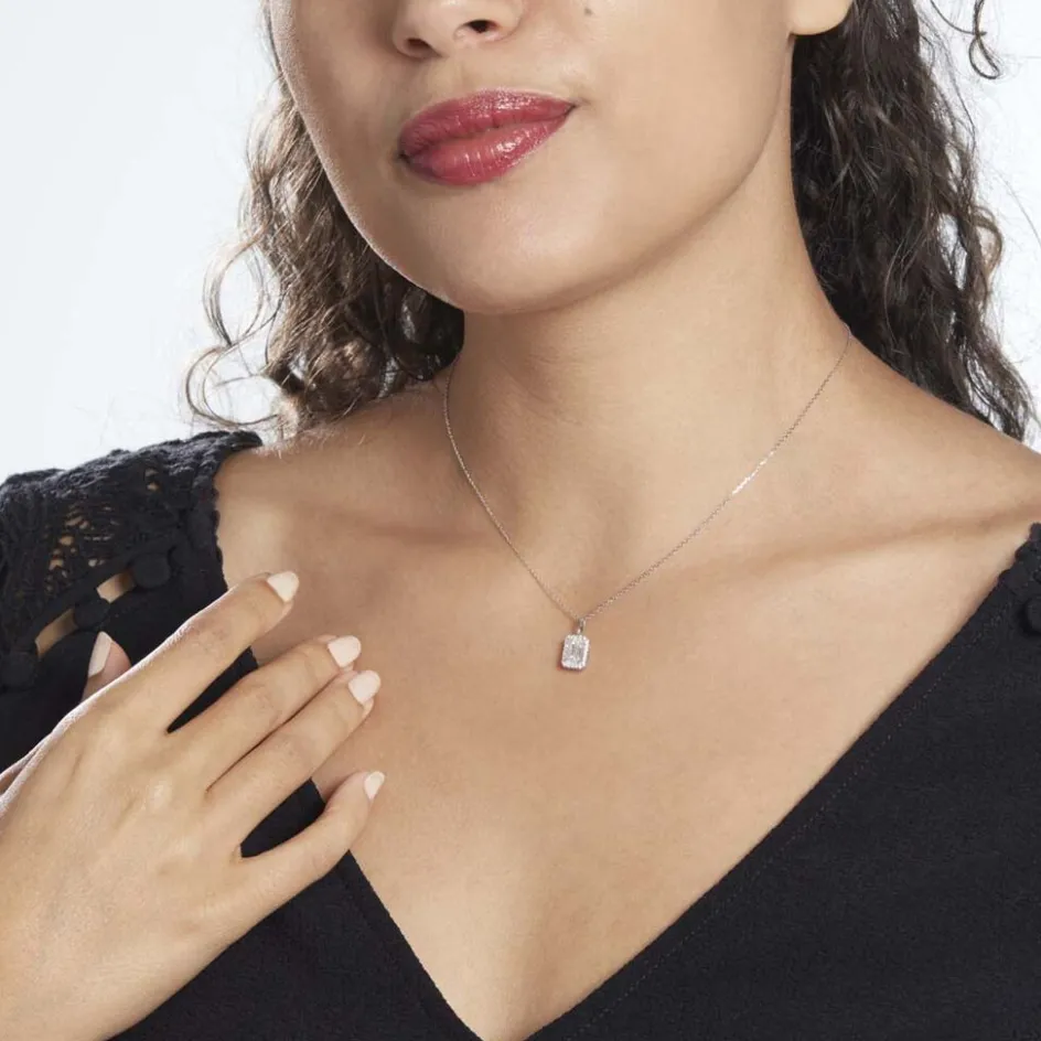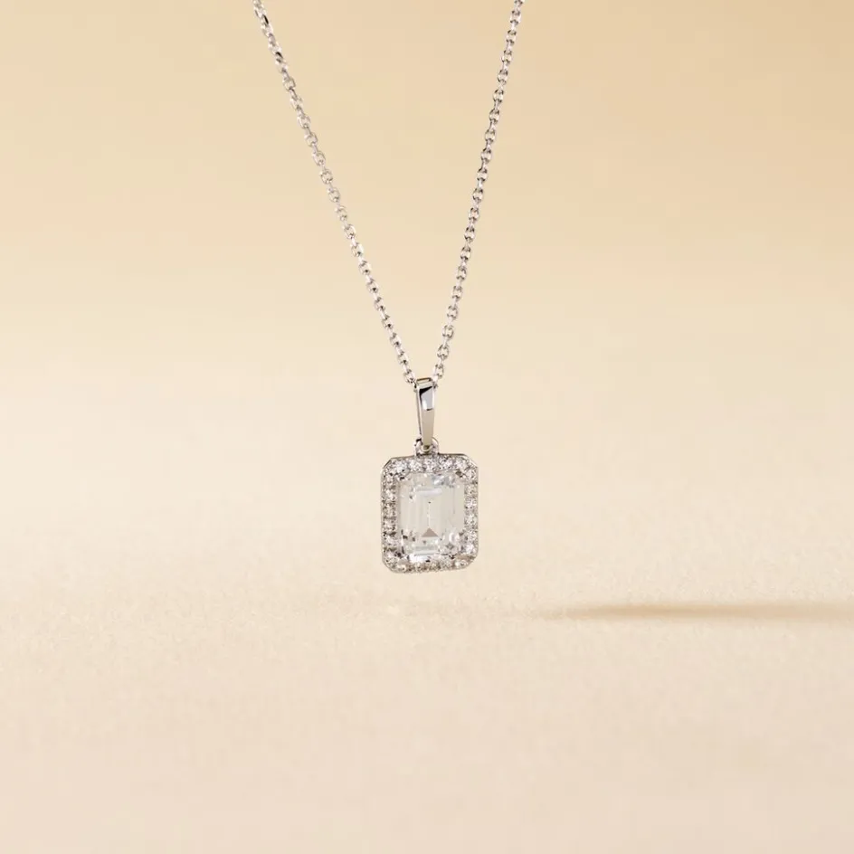Collier Or Blanc 375/1000 Oxyde De Zirconium Taille Emeraude Entourage Oxydes De Zirconium 40+2cm