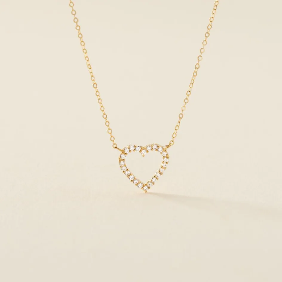 Collier Or Jaune 375/1000 C艙ur Ajouré Oxyde De Zirconium Blanc Serti Griffes Maille Forçat 45cm