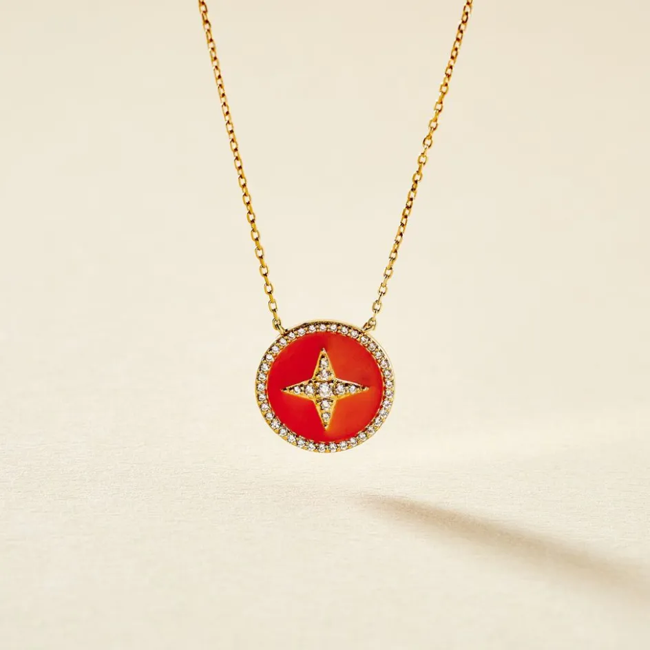 Collier Or Jaune 375/1000 Pastille Email Corail Etoile Du Berger Pavage Oxyde De Zirconium Chaine Maille Forcat 40+2cm