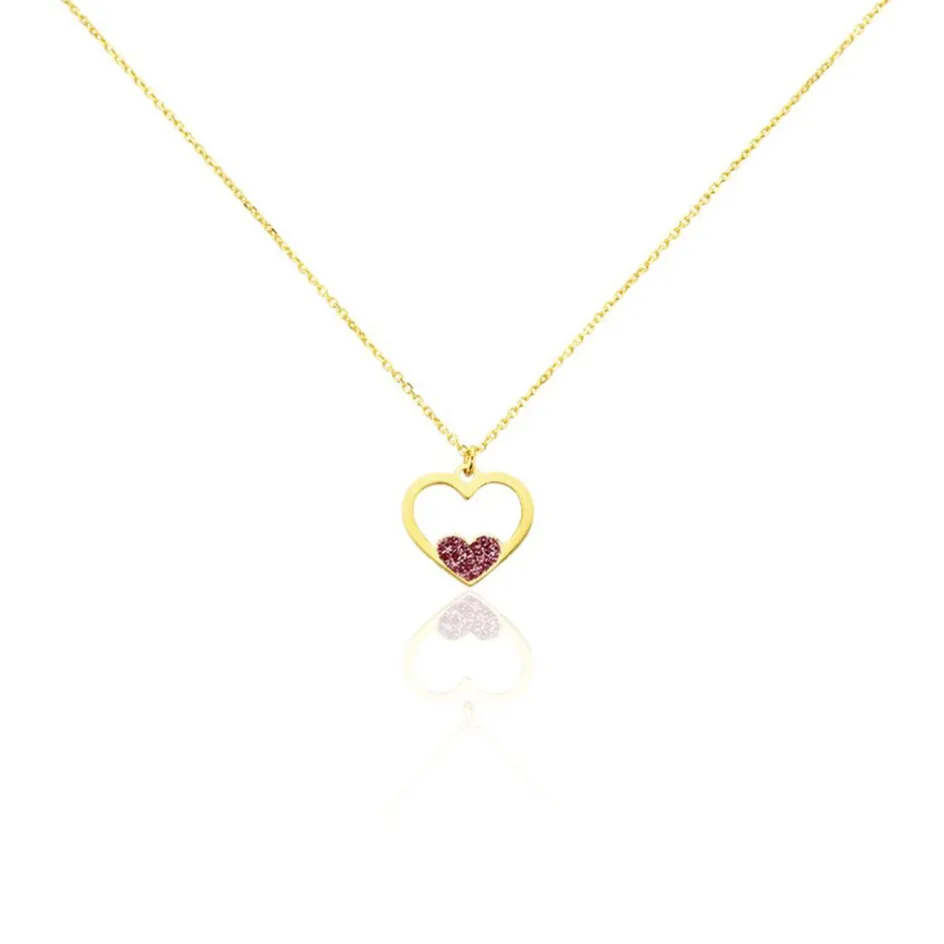 Collier Or Jaune 375/1000 Double Coeurs Glitter Rose Maille Jaseron 36/38cm