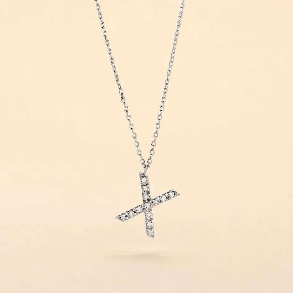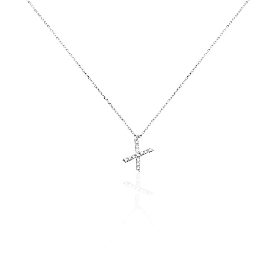 Collier Or Blanc 375/1000 Lettre X Pavage Diamants Maille Forçat 42cm