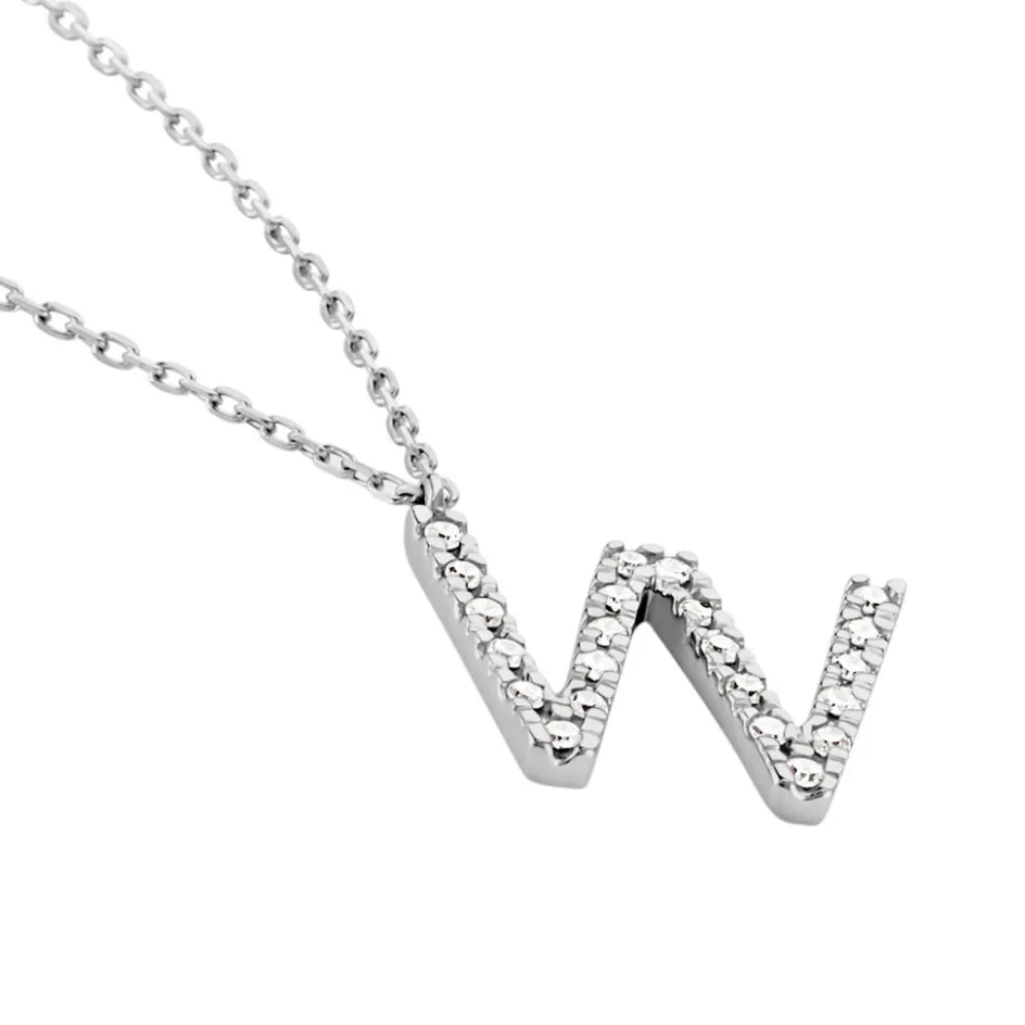 Collier Or Blanc 375/1000 Lettre W Pavage Diamants Maille Forçat 42cm