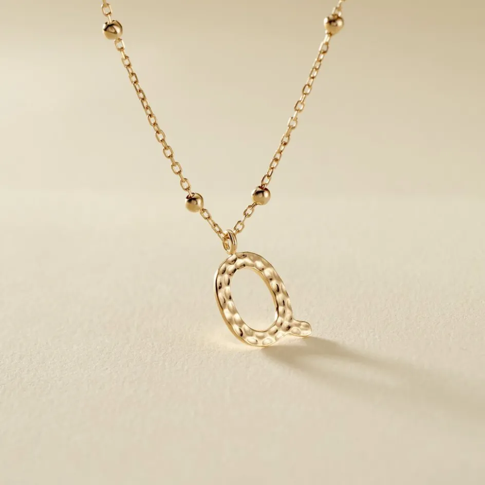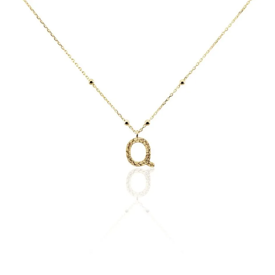 Collier Plaque Or Jaune Lettre Q Martelee Et Petites Boules Chaine Maille Forcat Longueur 45cm