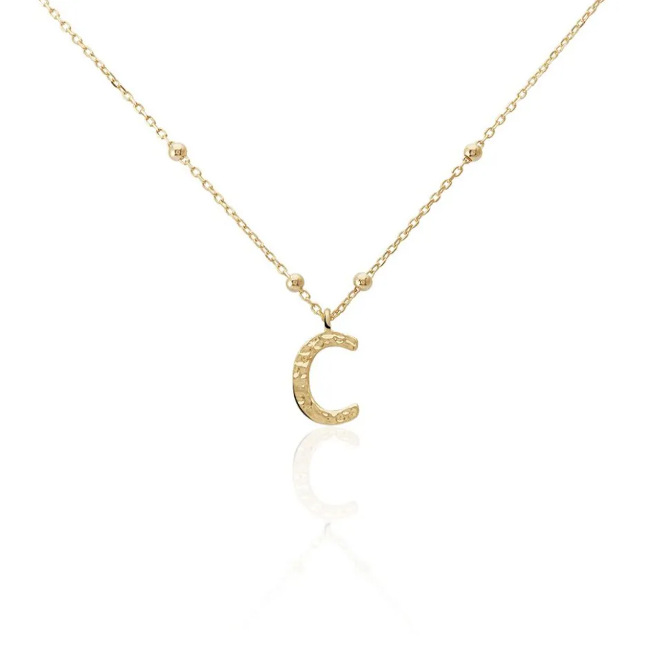 Collier Plaque Or Jaune Lettre C Martelee Et Petites Boules Chaine Maille Forcat Longueur 45cm