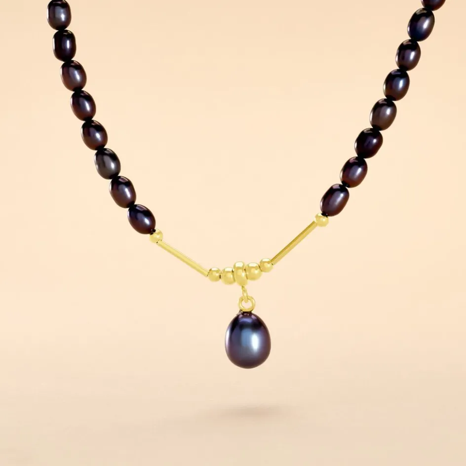 Collier Or Jaune 375/1000 Perles De Culture Noires Naturelles 4/4.5 Mm Et Perle Grain De Riz Noire 7.5/8mm 42cm