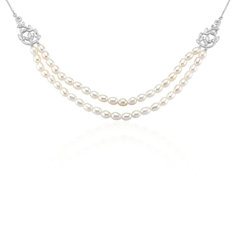 Collier Double Rang Argent Blanc 925/1000 Perles Naturelles D’eau Douce Micro Setting Oxydes De Zirconium 53cm