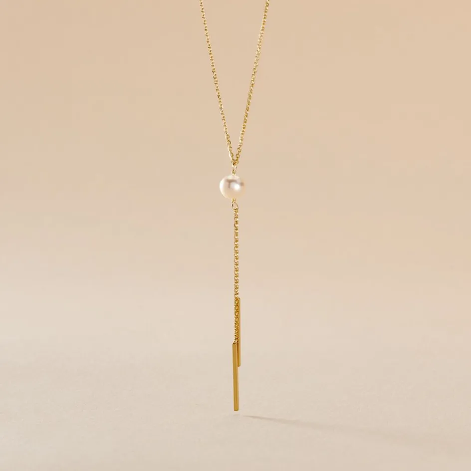 Collier Or Jaune 375/1000 Style Cravate Motifs Barres Pendantes Et Perle De Culture 42cm
