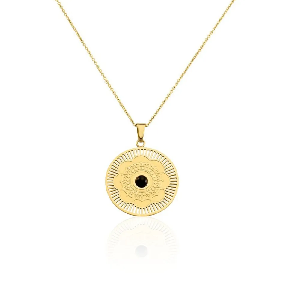 Collier Sautoir Acier Dore Rosace Agate Noire Maille Forcat 70cm